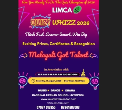 കലാഭവൻ ലണ്ടന്റെ നേതൃത്വത്തിൽ മാർച്ച് 14-ാം തീയതി ശനിയാഴ്ച ഉച്ചയ്ക്ക് 2 മണിമുതൽ Cardinal Heenan Catholic High School ൽ അരങ്ങേറുന്ന “മലയാളി ഗോട്ട് ടാലന്റ്” പരിപാടിയോടനുബന്ധിച്ച്, Liverpool Malayali Cultural Association (LIMCA) ഓൾ-യു.കെ. ക്വിസ് മത്സരം “LIMCA Quiz Whizz 2026” സംഘടിപ്പിക്കുന്നു. പ്രവാസജീവിതത്തിന്റെ നീണ്ട രാവുകളിൽ സ്വദേശത്തിന്റെ പ്രഭാതസ്മൃതികൾ പുനർജ്ജീവിപ്പിക്കാൻ, കലാസാംസ്കാരിക രംഗത്ത് ശ്രദ്ധേയമായ സാന്നിധ്യമായ കലാഭവൻ ലണ്ടൻ ഒരുക്കുന്ന “മലയാളി ഗോട്ട് ടാലന്റ്” പ്രതിഭകൾക്ക് വേദി തുറക്കുന്ന നവോത്ഥാന സംരംഭമാണ്. മനസ്സുകളിൽ ഒളിഞ്ഞിരിക്കുന്ന കലാസ്വരങ്ങളെ വേദിയുടെ വെളിച്ചത്തിലേക്ക് ക്ഷണിക്കുന്ന അതുല്യാവസരമാണ് ഈ പരിപാടി.